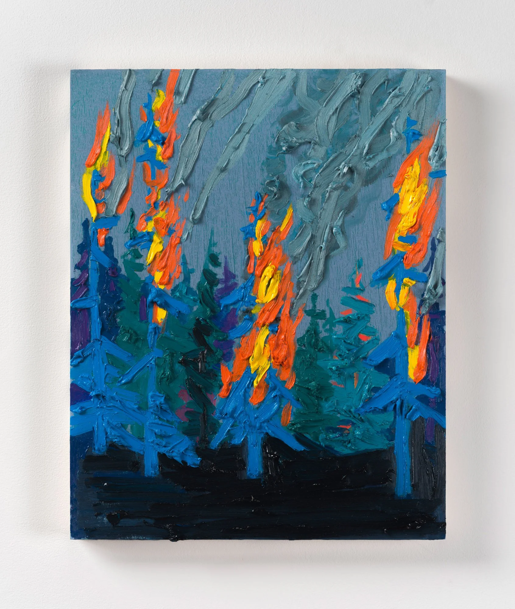 When I see the painting, it’s not finished. There are pieces of tape in places where Dorland has scrawled, ‘fix’, ‘bridge’ or other notes to himself. Surveying the room, there are many smaller works on walls, in boxes, or leaning together waiting to get shipped out. Several key themes emerge in this body of work, the most urgent is that the artist’s world is burning up, everything is on fire. Blackened trees are engulfed in vivid flames, skeletons clasp hands in an attempt to escape the inferno. Yet, Dorland takes us by surprise, because it’s not all dark. There are portraits of Lori, the intense impasto that comprises her face, is, to Dorland, her actual face, layered, complex and beautiful. There are nocturnes with lush landscapes under skeleton moons and verdant trees with layers so dense and so green you want to reach out and touch them.