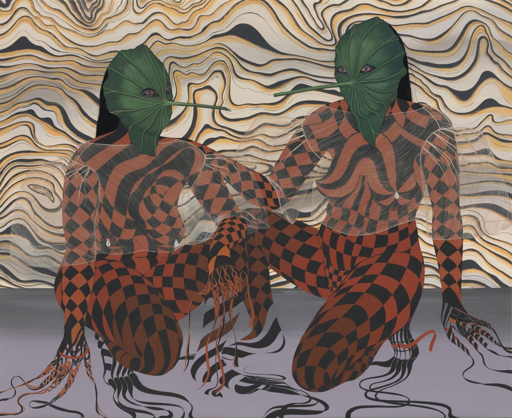 The themes of mutual support, labour, mothering, and ancestral materiality are exquisitely portrayed in shroud (kalabaw and death mask) (2025). This work centers on two figures: the kalabaw [1] and a human-like figure adorned with a death mask. Though different, the painting reveals them as mirrors of one another—coexisting in quiet harmony. They are in symbiosis, akin to epiphytic plants that grow upon a host without sowing harm. This mutuality is both an ecological reality and a metaphor for the Filipinx diaspora: a sacred entanglement. By collapsing the boundaries between life and death, Santos weaves together themes of humanity’s deep-rooted interconnectedness with nature and ancestry.