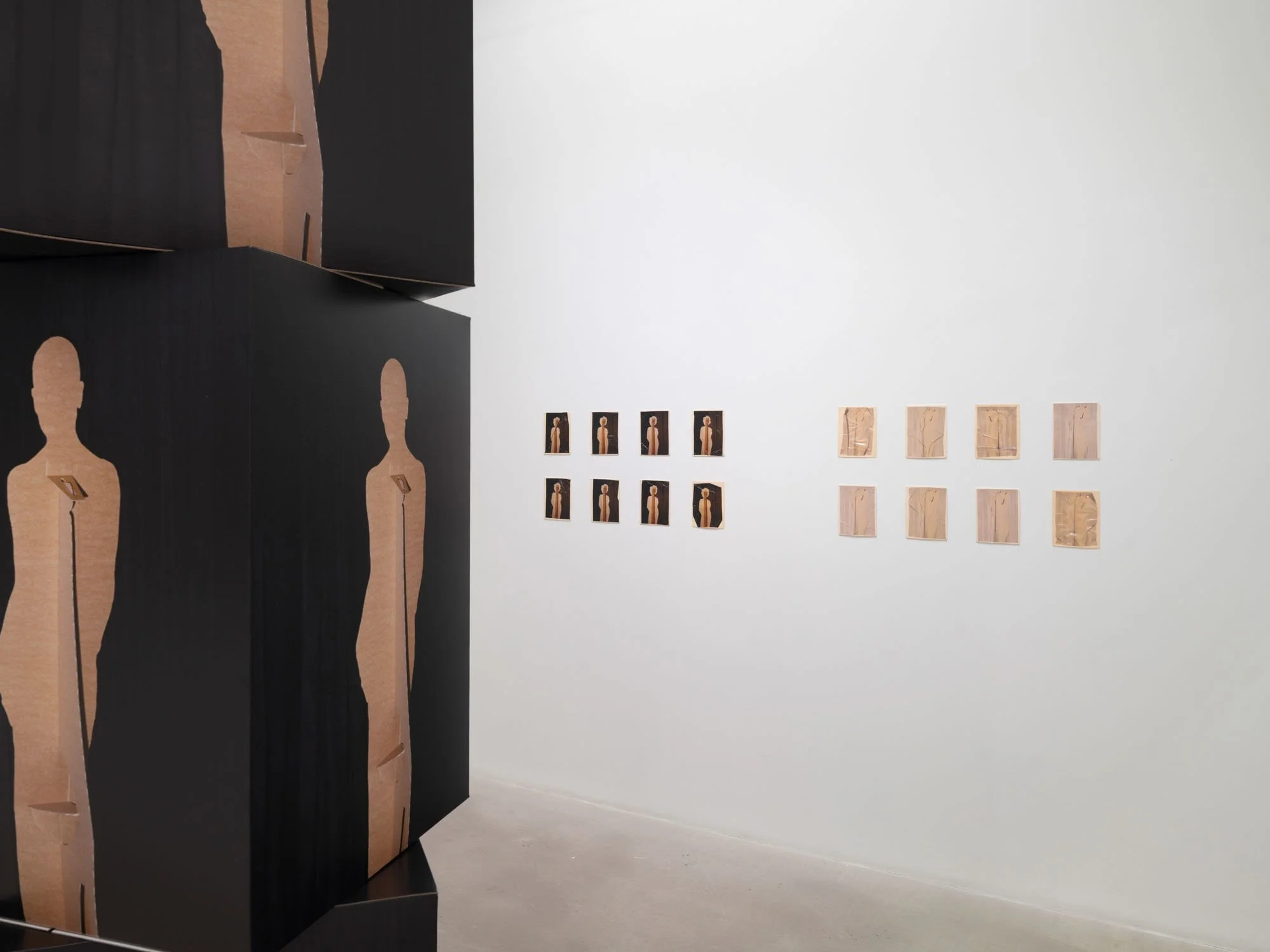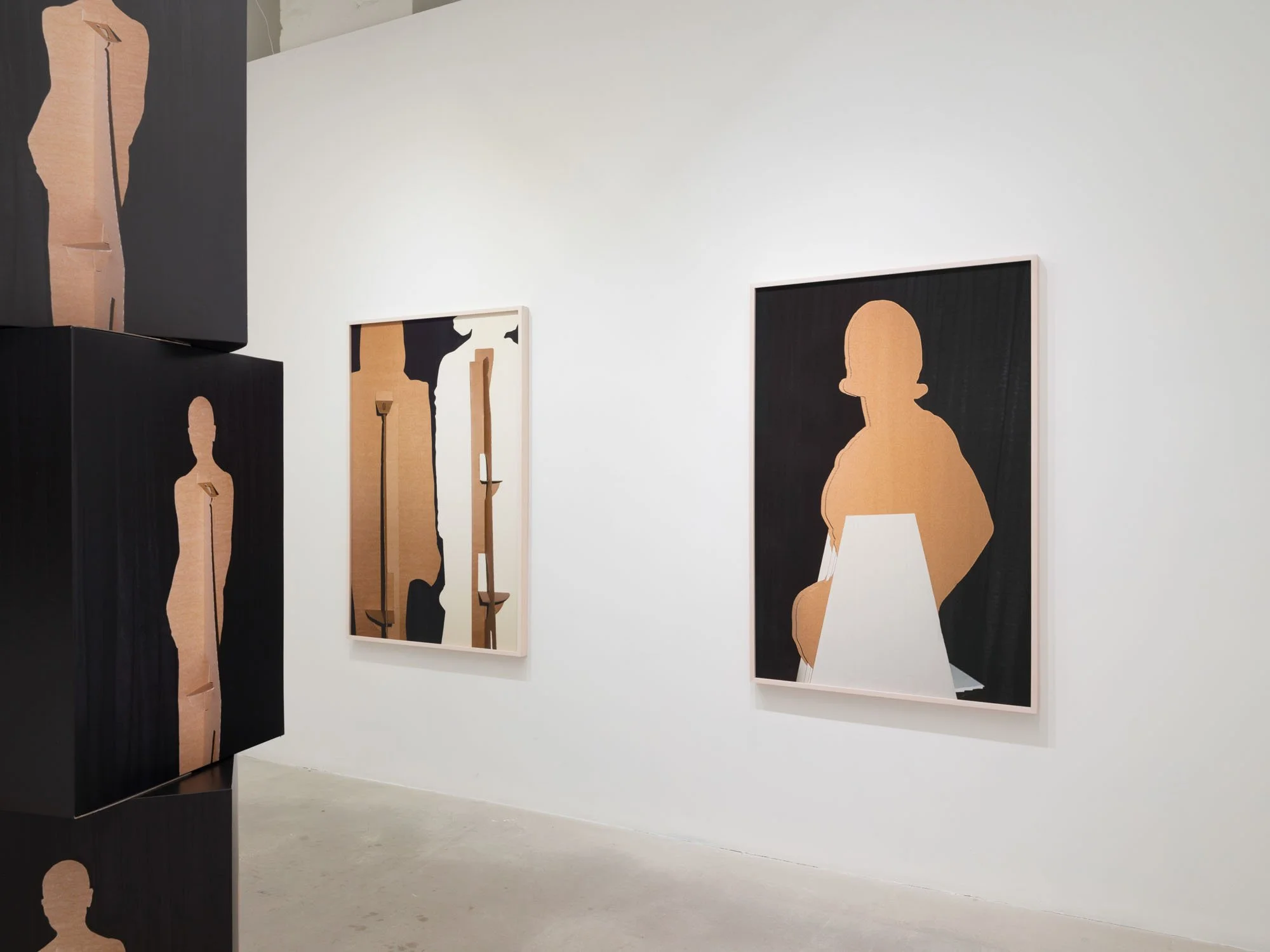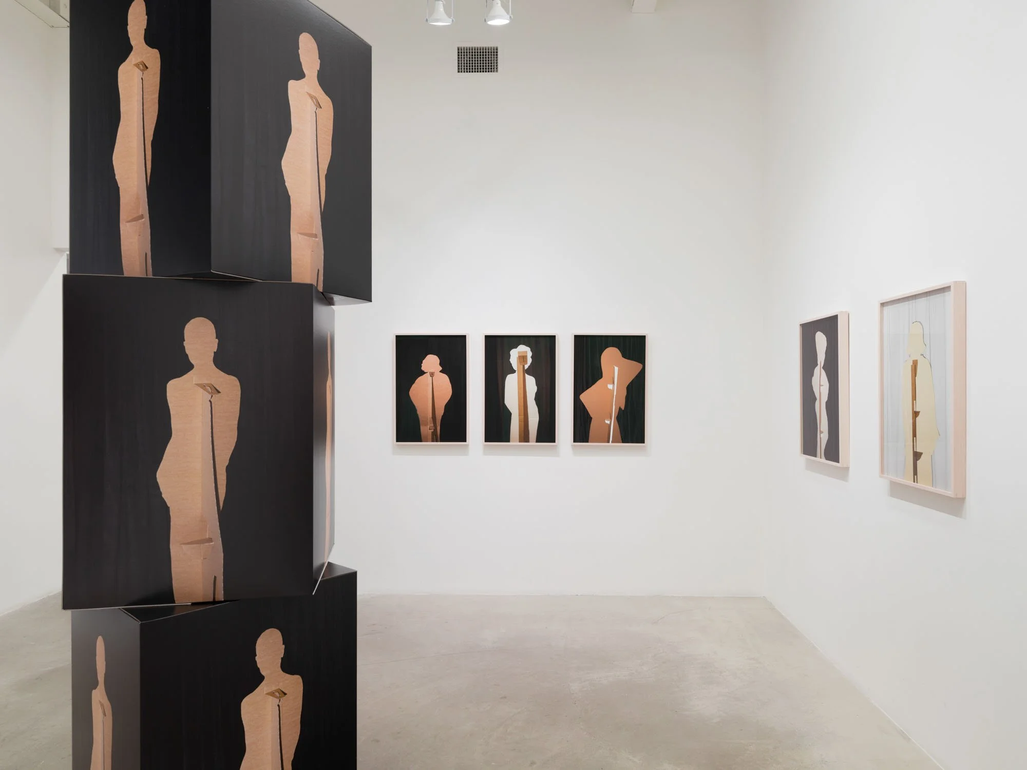 Fuhr brings this trajectory into the present. Staged against drapery, her cardboard silhouettes hover between portrait and prop, subject and object. Each figure is both present and absent, a hollow outline suspended between sculpture and shadow, gallery and backstage. Many are fragmented, faceless, or interrupted by supports, hinting at the constructed nature of self and the personas we perform. Through photography and object-making, she pushes the material further by tattooing bodies onto silicone latex that mimics skin, blurring the line between flesh and image. The works are uncanny, showing how forms can be stretched, worn thin, and endlessly reproduced. They mark the tension between who we are and what we present to the world, inviting viewers to consider their own bodies, performances, and layered identities.