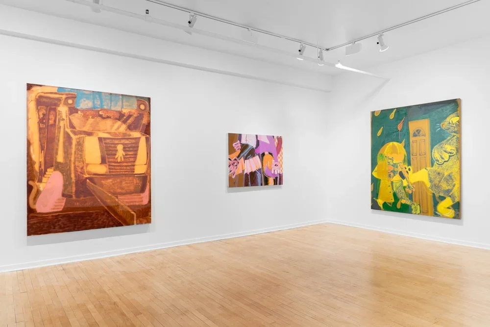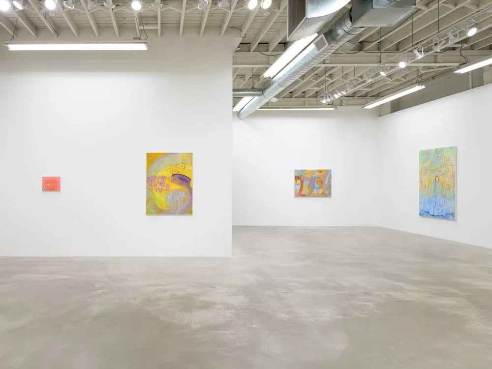 Who are the figures that populate this dreamscape, their heads like double scoops of ice cream, their mitten-like paws gripping what might be a cell phone, a microphone, a martini glass, an ass? Seen across successive paintings, these characters form the cast of a cartoon show rendered in hazy neon, like the ones that used to air on cable after dark. Perhaps these figures go dancing, grab a drink, or take a nice hot bath.