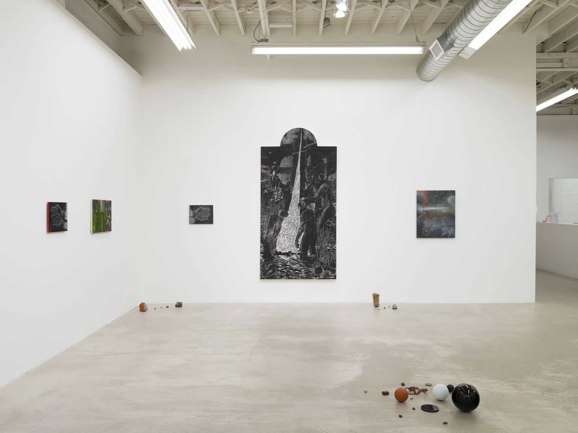 Sergio Suárez’s woodcuts construct scenes that exist at the periphery of visibility — a space in which cosmic interconnectivity fuses with quotidian experiences of the ineffable. Suárez describes his woodblock printing practice as “composing in time”, and it is as if each work contains an internal mythology, to which the viewer is privy to a single moment in an unknown, prolonged chronology. Every scene feels temporally in flux, existing as stamps from an ambiguous epoch, amplified by the weaving of mixed iconographies like Mesoamerican cosmologies, catholic theological painting, contemporary telescopic observations, and western metaphysical philosophy, and Western metaphysical philosophy. These works contain an intricate balance of pressure and lightness, thematically with the omission of sunlight, and physically with the necessary force to make the marks in the wood for printing. Like a blurred mass passing beneath a streetlamp, these works exist in partial occlusion, resulting in certainty being supplanted by imagination.