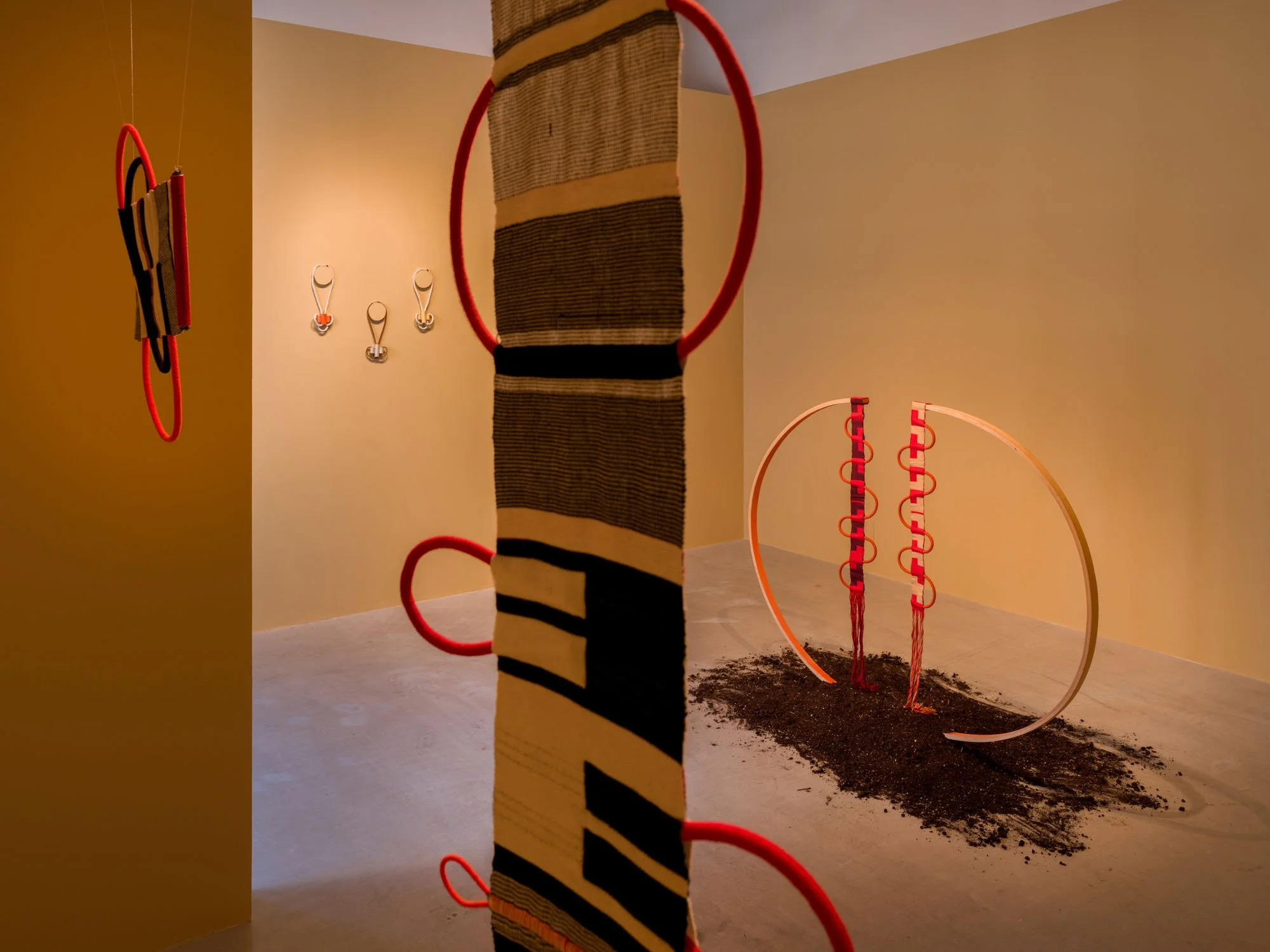 Elegy for a matriarch whose spirit pulses through soil and rises with the sun, eternally. This is where words meet cloth. This is where the practice of weaving becomes the practice of mourning. This is where textile and text meet each other – a sculpture of colourful double cloth and arching coils, paired with bent wood and dark soil – as a lament for the dead. The matriarch is Ishaq’s grandmother who died in Uganda during the pandemic. When their funerary practice necessitated a quick burial that she could not attend, weaving was the way she could extend the period of mourning. The artist explored form in new ways while living with grief, working on a handloom, connecting to her grandmother who was also a weaver. She considered the warp of the cloth as a time plane and the layers of double weaving as multiple temporalities. The word “eternally” finds its expression in the looping form of the coils. “As we mix their essence with the earth, We remember them, And within us, They live” is the last line of an Octavia Butler excerpt that Ishaq calls our attention to.