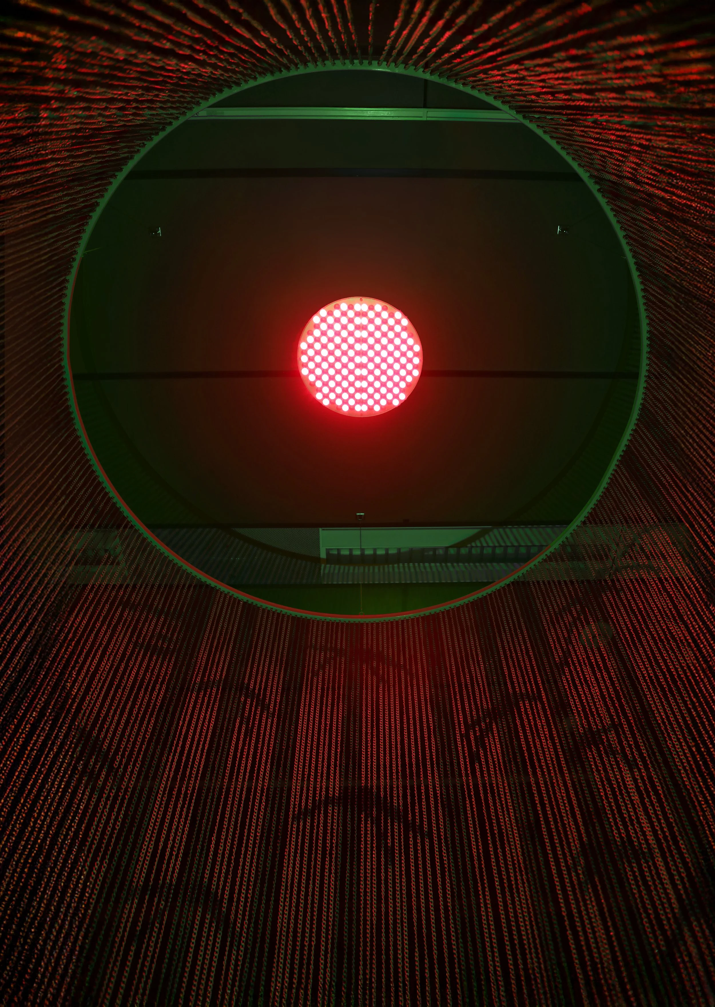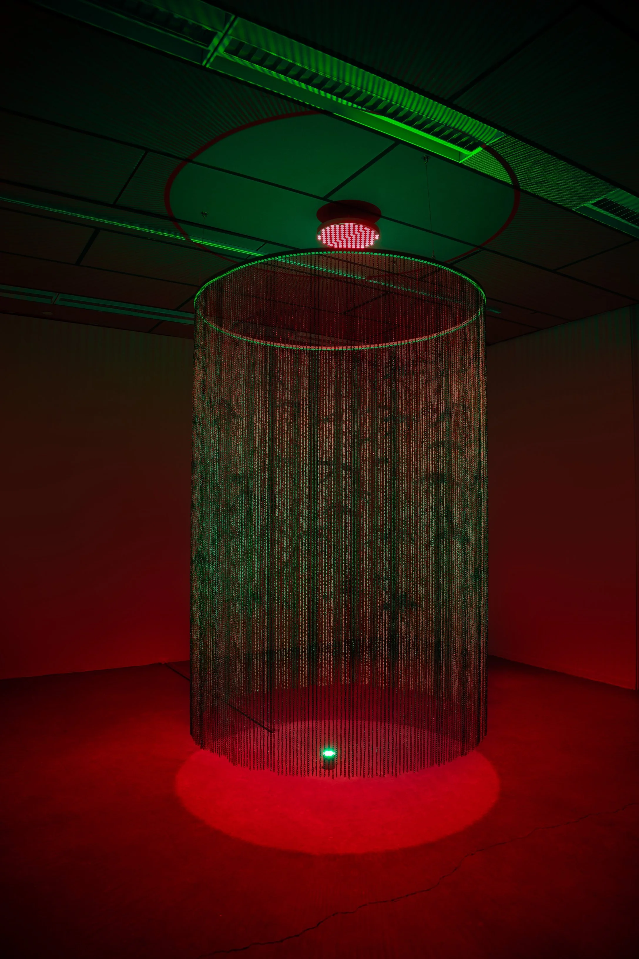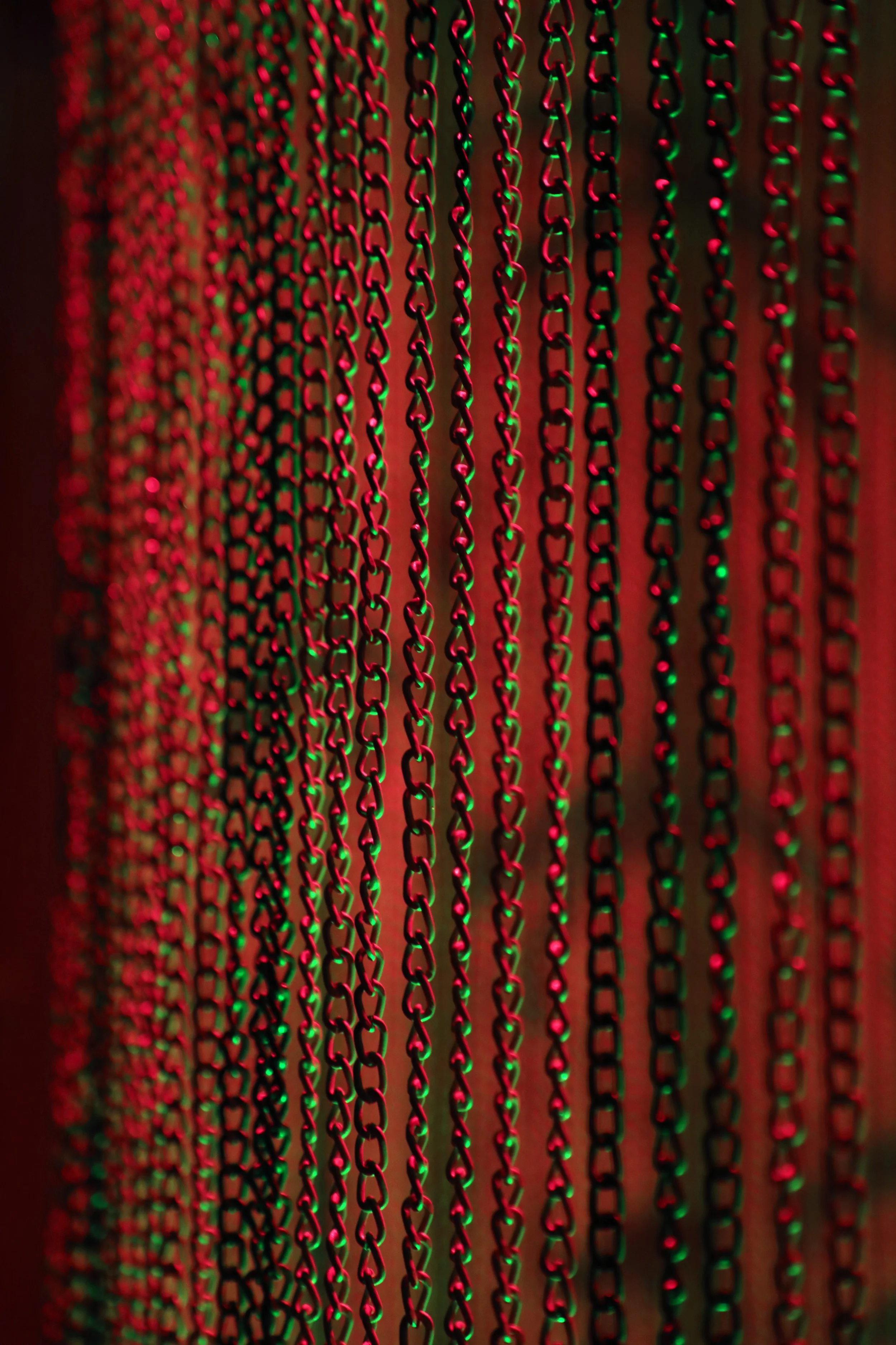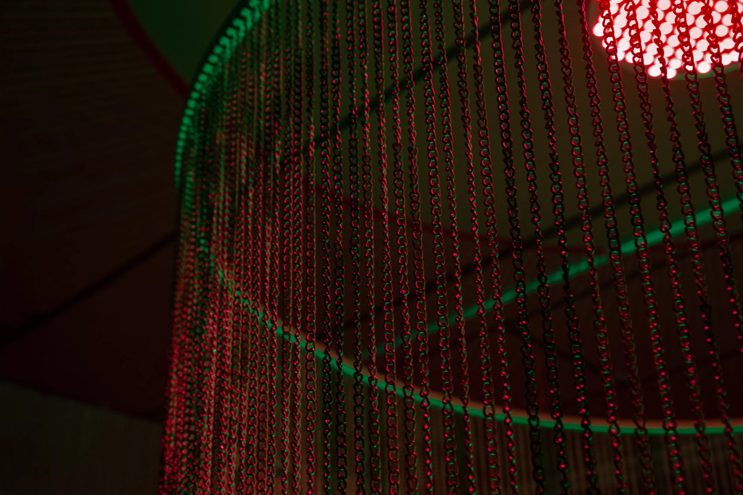 Bamboo Canopy engages with Zhang’s exploration of the visual and physical spread of the bamboo plant. Bamboo was first introduced to North America in 1882 as an ornamental plant; as it spread, it came to be classified as invasive. Zhang engages with bamboo as a metaphor for how othered bodies are perceived as both ornamental and threatening—simultaneously aestheticized and feared. The work draws inspiration from films such as A Touch of Zen (1971), Crouching Tiger, Hidden Dragon (2000), and House of Flying Daggers (2004), each featuring a climactic scene set within a constructed bamboo forest. These stylized, highly choreographed film settings function as both backdrop and symbol—sites of transformation and tension. The work reflects on the afterlife of East Asian decorative motifs in film, and in the selected pieces, frame bamboo not as markers of otherness, but as sites of continual transformation. Within the installation, a chain-linked curtain produces a moiré effect, allowing viewers to see the forest first and the exterior second, suggesting a layered interiority. In Bamboo Canopy, an ominous red LED light hangs above while green light emanates from a bamboo ash container below. The viewer is positioned within the forest canopy, suspended between two contrasting illuminations: the red light associated with skin regeneration and transformation, and the green light evoking renewal and resurrection.